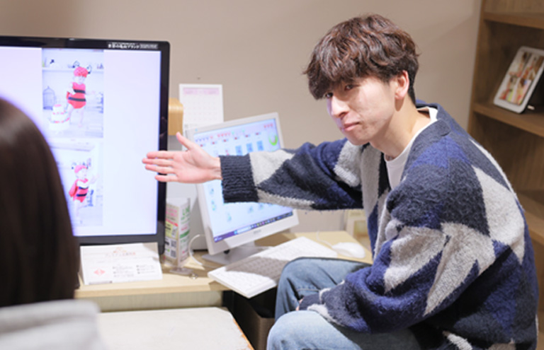 新規来店されたお客様へアルバムの説明やご要望をヒアリング。他のフォトグラファーの撮影アシスタントとして撮影に同席!