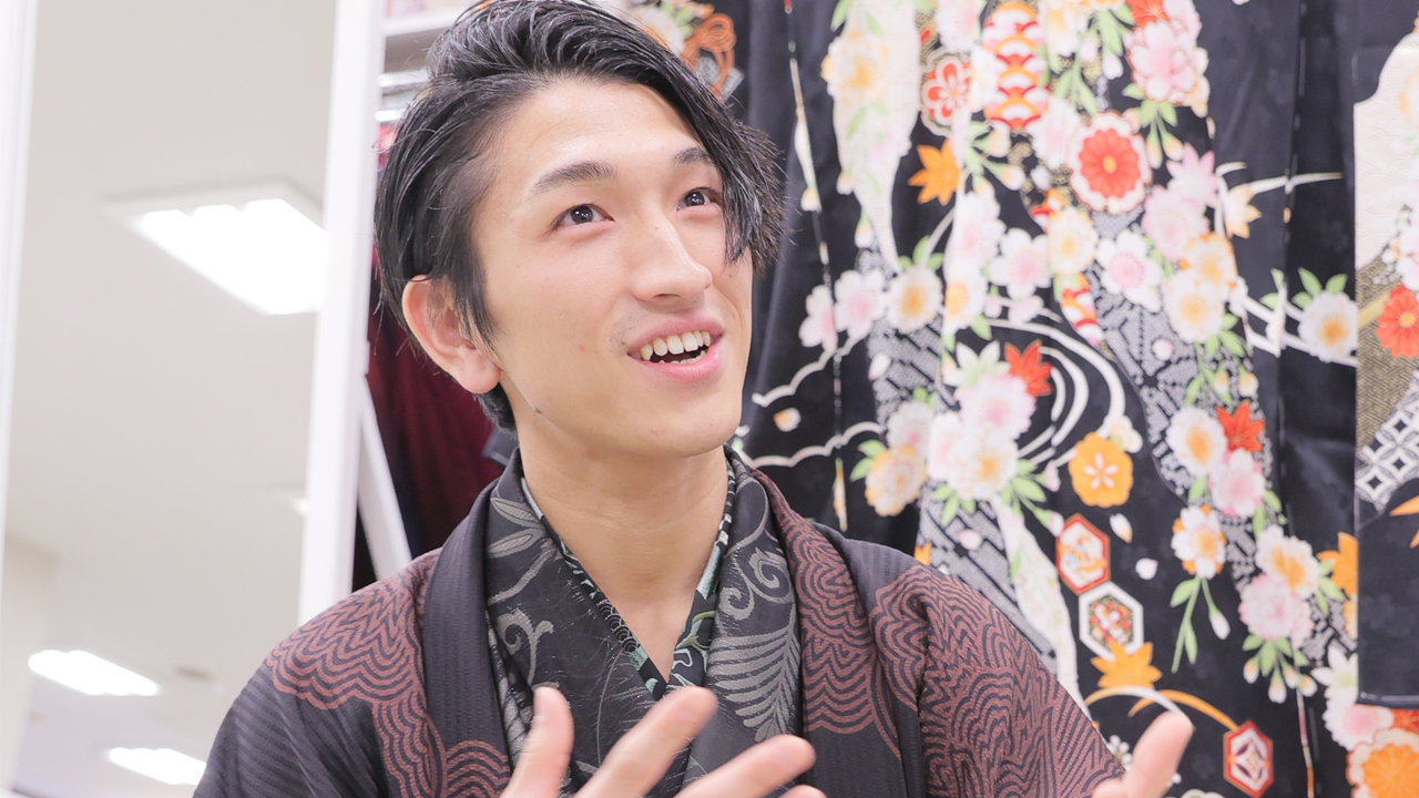 きものは反物の状態で販売しているため、着たときのイメージをつけてもらうためにお洋服の上から着物を着ている風に試着をしていきます。試着をしていただく際には着装というスキルが必要になります。